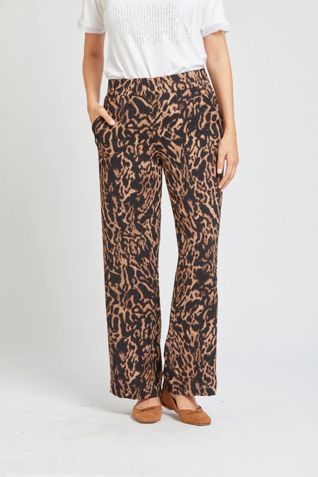 Pantalón Aline, un pantalón tipo palazzo confeccionado en crepe se seda de alta calidad, que ofrece caída fluida y comodidad. Su estampa leopardo aporta un toque moderno y sofisticado para tus looks diarios o salidas especiales.
